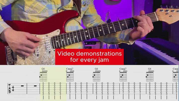 A: Yes — every jam includes a video demonstration AND a play-along jam track, so students always have guidance and something fun to play with.